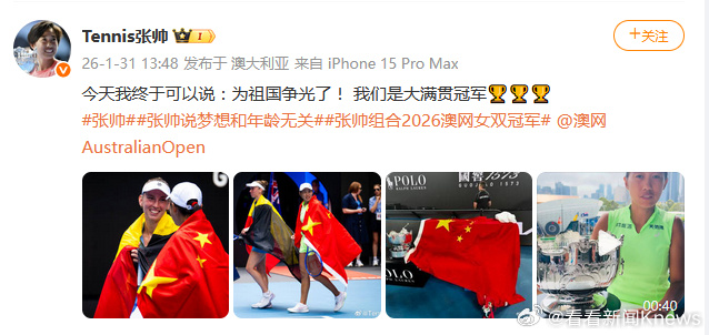 賽后,張帥在社交平臺發(fā)文:“今天我終于可以說:為祖國爭光了!我們是大滿貫冠軍”。